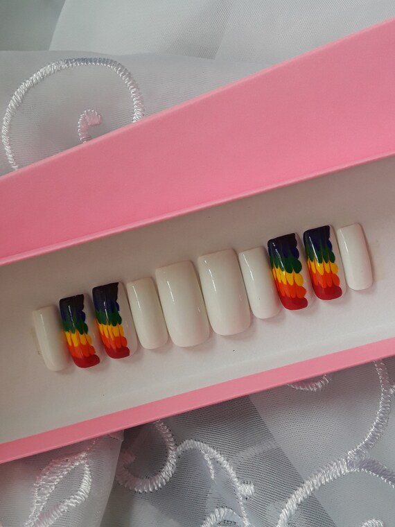 Rainbow White Gel Long Square Press On Nails Medium 16458 Etsy