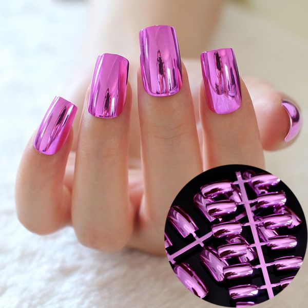 Long Square Press On Nails Rose Red Mirror Metal False Nails